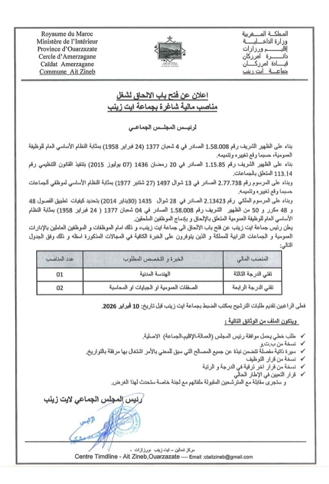 تعلن الجماعة عن فتح باب الإلحاق لشغل مناصب مالية شاغرة بجماعة ايت زينب